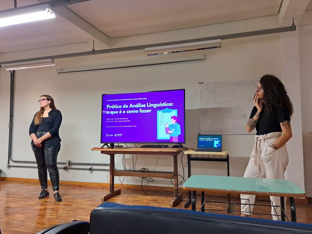 Na última terça-feira (23), aconteceu o segundo encontro do I Ciclo de Formação de Professores de Língua Portuguesa, organizado pelo NEPELIN em parceria com o Programa Institucional de Bolsistas de Iniciação à Docência (Pibid) e com o Programa de Residência Pedagógica (PRP) em Língua Portuguesa, da Universidade Federal de Santa Maria (UFSM). O evento aconteceu no auditório do prédio 40A e contou com as falas das professoras mestras Taís Vasques Barreto e Camila Steinhorst, que apresentaram definições teórico-metodológicas do conceito de Prática de Análise Linguística.