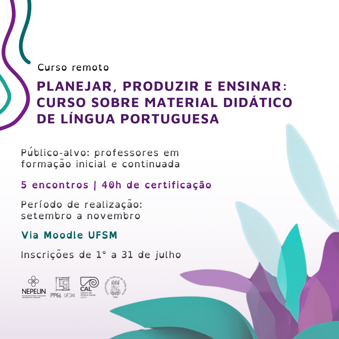 Planejar, produzir e ensinar: curso sobre material didático de Língua Portuguesa é um curso remoto e gratuito. Oferecido via plataforma Moodle da UFSM, é voltado a professores em formação inicial e continuada e tem como objetivo promover reflexões críticas sobre o ensino de Língua Portuguesa a partir da produção e análise de material didático. Com encontros síncronos realizados às 19h, o curso articula teoria e prática em cinco módulos.